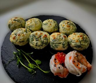 Состав: рис, нори, сыр Креметта, креветка Ванамей, жареные шампиньоны, сырная шапочка с укропом