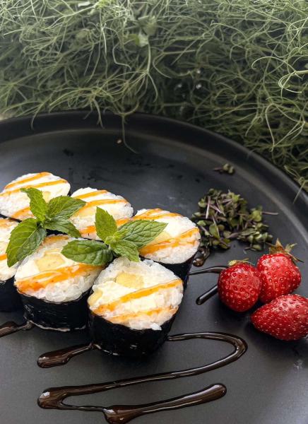 Состав: рис, нори, сыр Креметта, манго, соус манго.