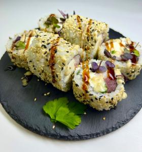 рис, нори, сыр Креметта, охлажденный тунец, креветка Ваннамей, огурец, кунжут.