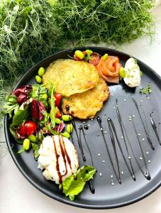 Подаются с салатной зеленью, томатами черри, бобами Эдамаме и сыром Креметта.