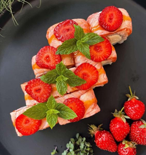 Состав: рис, нори, творожный сыр, опаленный лосось, клубника, соус манго.