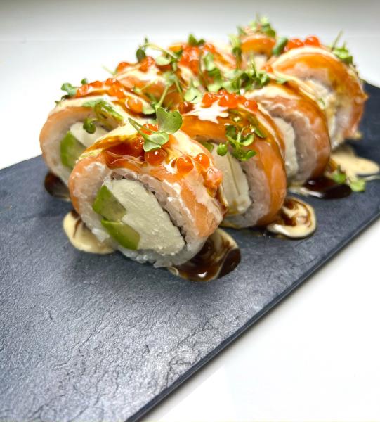 Украшение: соус терияки, ореховый соус, икра лосося, микрозелень