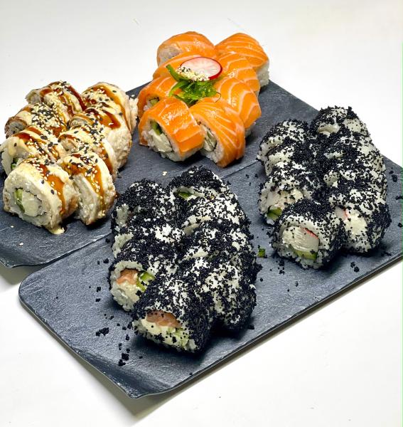 Состав: калифорния с лососем, калифорния с крабом, филадельфия классик, канада.