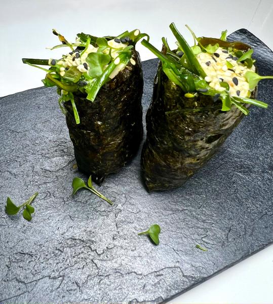 Состав: рис, нори, чука салат, ореховый соус.