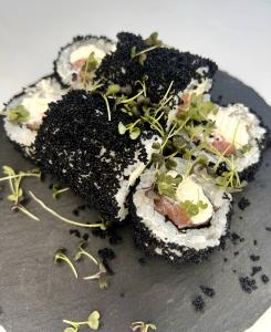 рис, нори, сыр Креметта, лосось, огурец, икра летучей рыбы.