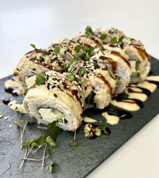 Украшение: соус Унаги, ореховый соус, кунжут, микрозелень