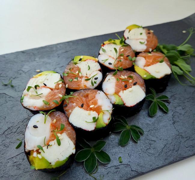 Состав: нори, лосось, креветка Ванамей, снежный краб, авокадо