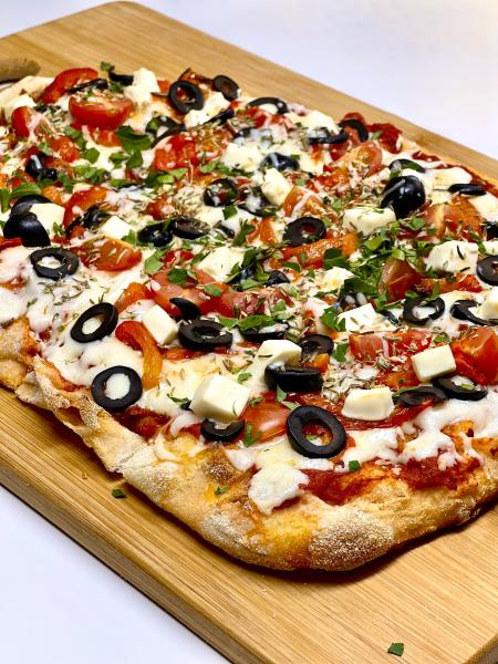Состав: моцарелла, томаты черри, печённый перец, маслины, сыр Фета, оливковое масло, красный соус, зелень.