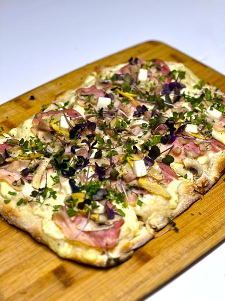 Состав: бекон, артишоки, сыр Фета, моцарелла, халапеньо, белый соус, зелень.