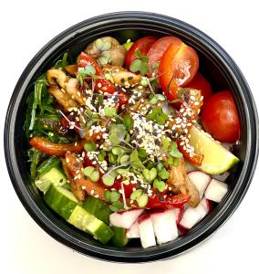 Состав: рис, томаты черри, чука салат, огурец, авокадо, болгарский перец, куриное бедро, редис, терияки соус, ореховый соус, бобы Эдамаме, лайм, кунжут, микрозелень.