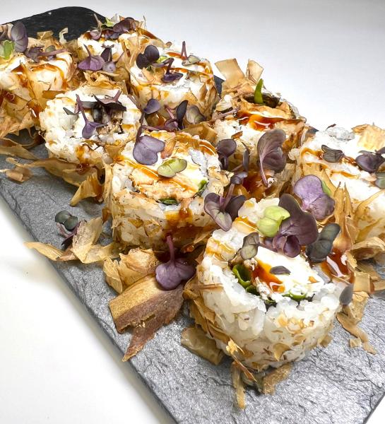 рис, нори, сыр Креметта, копчённый лосось, зелёный лук, стружка тунца.