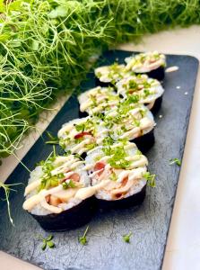 Состав: рис, нори, салат айсберг, свежий помидор, куриное бедро.