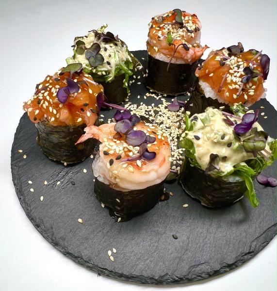 рис, нори, сыр Креметта, креветка Ваннамей, лосось, чука салат, соус манго, ореховый соус, свит-чили соус.