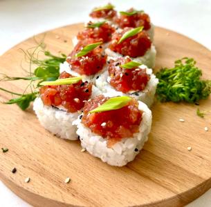Состав: рис, нори, сыр Креметта, авокадо, тунец, соус свит-чили.