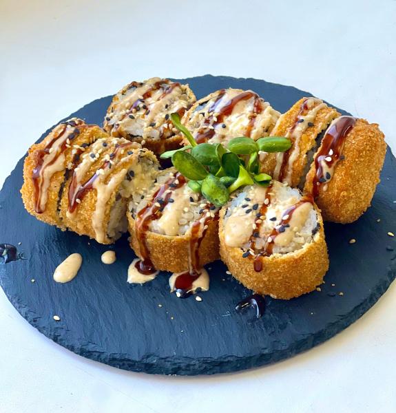 Состав: рис, нори, сыр Креметта, копчённый лосось, кляр.