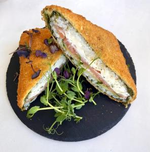 Состав: рис, нори, творожный сыр, филе лосося, огурец, кляр.