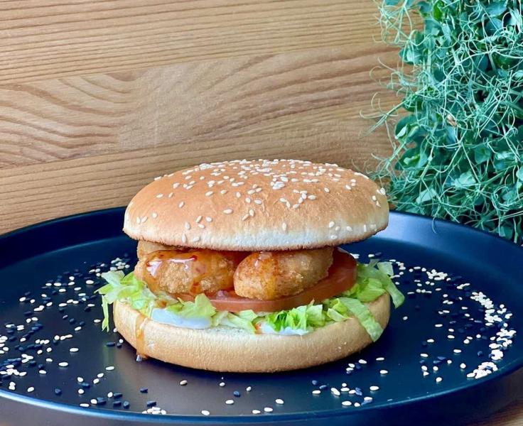 Состав: булочка с кунжутом, креветки в панировке, помидор, салат айсберг, соус тар-тар, соус свит-чили.