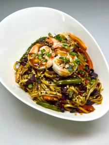 Состав: лапша, креветки Ваннамей, морковь, перец болгарский, стручковая фасоль, соус, кунжут, бобы Эдамаме, зелень.