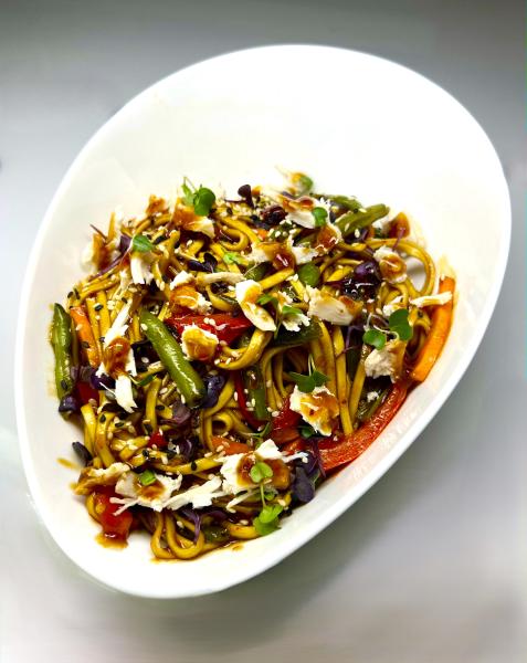 Состав: лапша, куриное бедро, морковь, перец болгарский, стручковая фасоль, соус, кунжут, бобы Эдамаме, зелень.