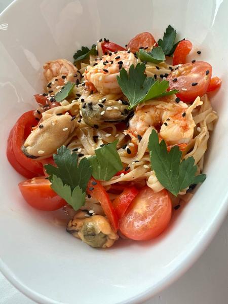 Состав: лапша соба, креветки, мидии, перец болгарский, черри, шампиньоны, соус том ям, зелень