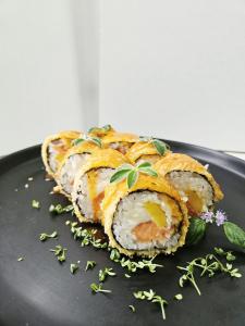 Состав: рис, нори, сыр Креметта, лосось, манго, соус манго