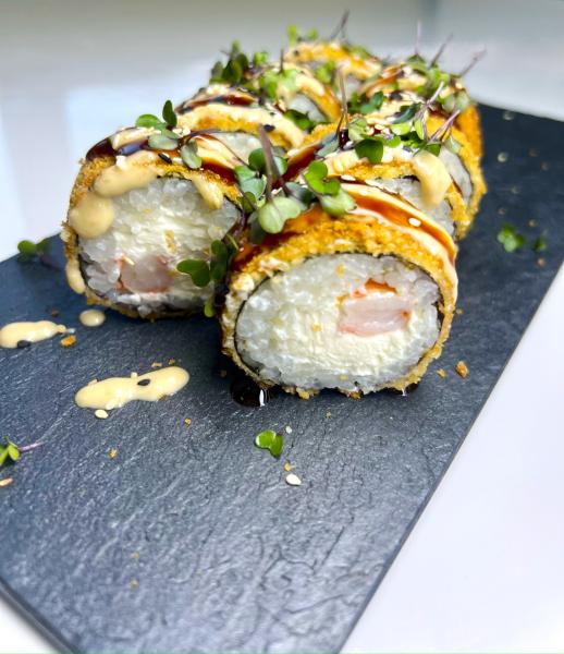 Состав: рис,нори, сыр Креметта, креветка Ваннамей, кляр.