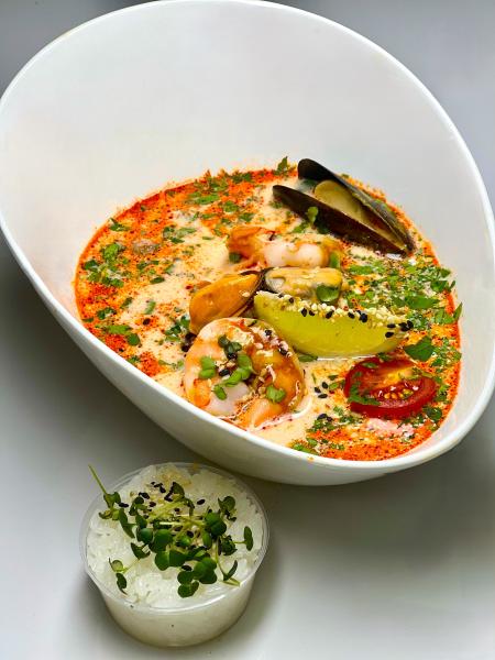 Состав: паста том ям, рыбный бульон, мидии, креветки, лосось, кальмар, грибы, кокосовое молоко, томаты черри, зелень, лайм, рис.