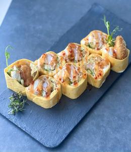 Состав: сырная лепёшка, сыр Креметта, креветка в панировке, пекинская капуста, свежий огурец, соус свит-чилли, микрозелень.