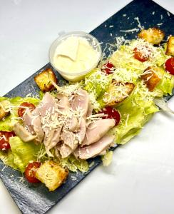 Состав: лист салата, томаты черри, сухарики, соус от шеф-повара, пармезан, нежное куриное бедро.