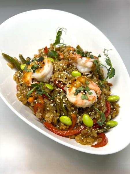 Состав: рис, креветка Ваннамей, морковь, болгарский перец, стручковая фасоль, кунжут, соус, бобы Эдамаме, зелень.