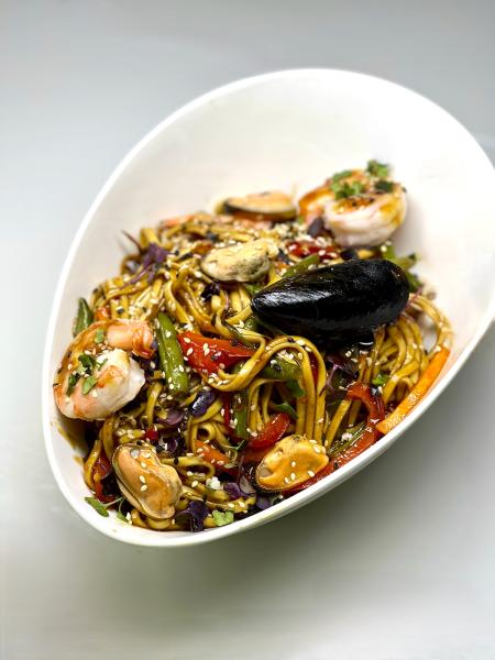 Состав: лапша, мидии, кальмары, креветки Ваннамей, лосось, морковь, перец болгарский, стручковая фасоль, соус, кунжут, бобы Эдамаме, зелень.
